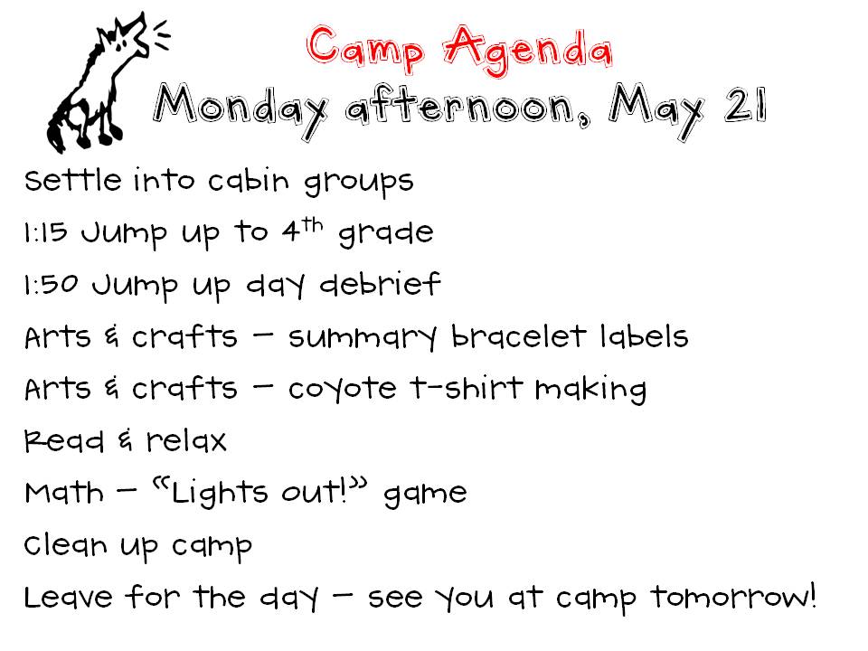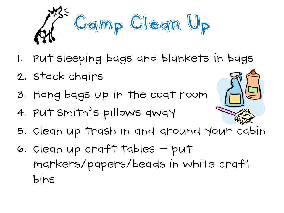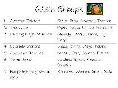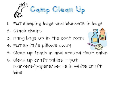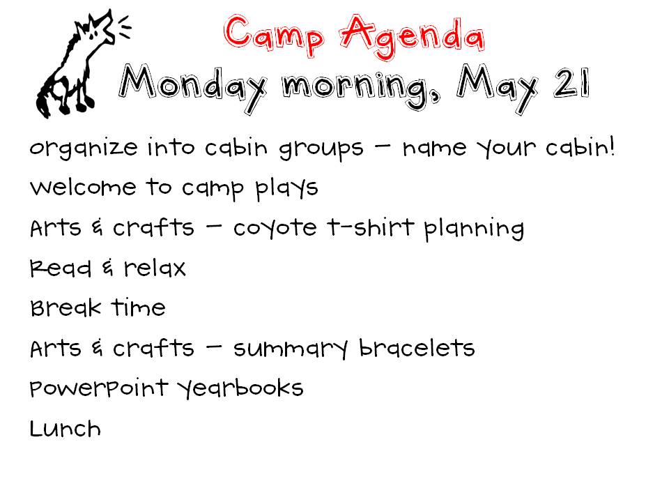 We organized everything (schedule, cabin groups, instructions for projects and jobs) with a simple PowerPoint. Since those last days of school are so weird with assemblies, activities, etc. it was nice to have an agenda up there all day (but easily changeable) for the kids (and for me!).