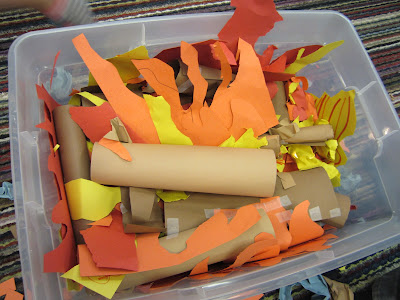 They also enjoyed building our campfire which, as you can see, turned into a plastic tub of construction paper scrappies, but I gave up the “we must make a pretty campfire” battle. They loved it, even though it looks kindof like a big box of colored trash. 🙂