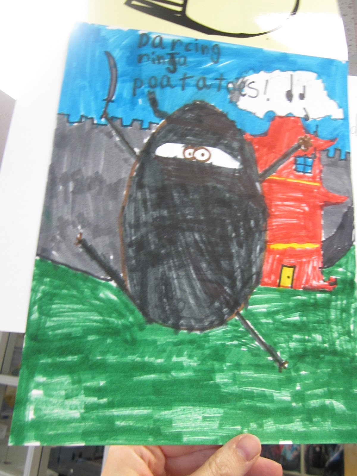 On Day 1 we only completed cabin organization, names, and art pieces. My favorites are the Fluffy Lightning Soccer Cats and the Dancing Ninja Potatoes.