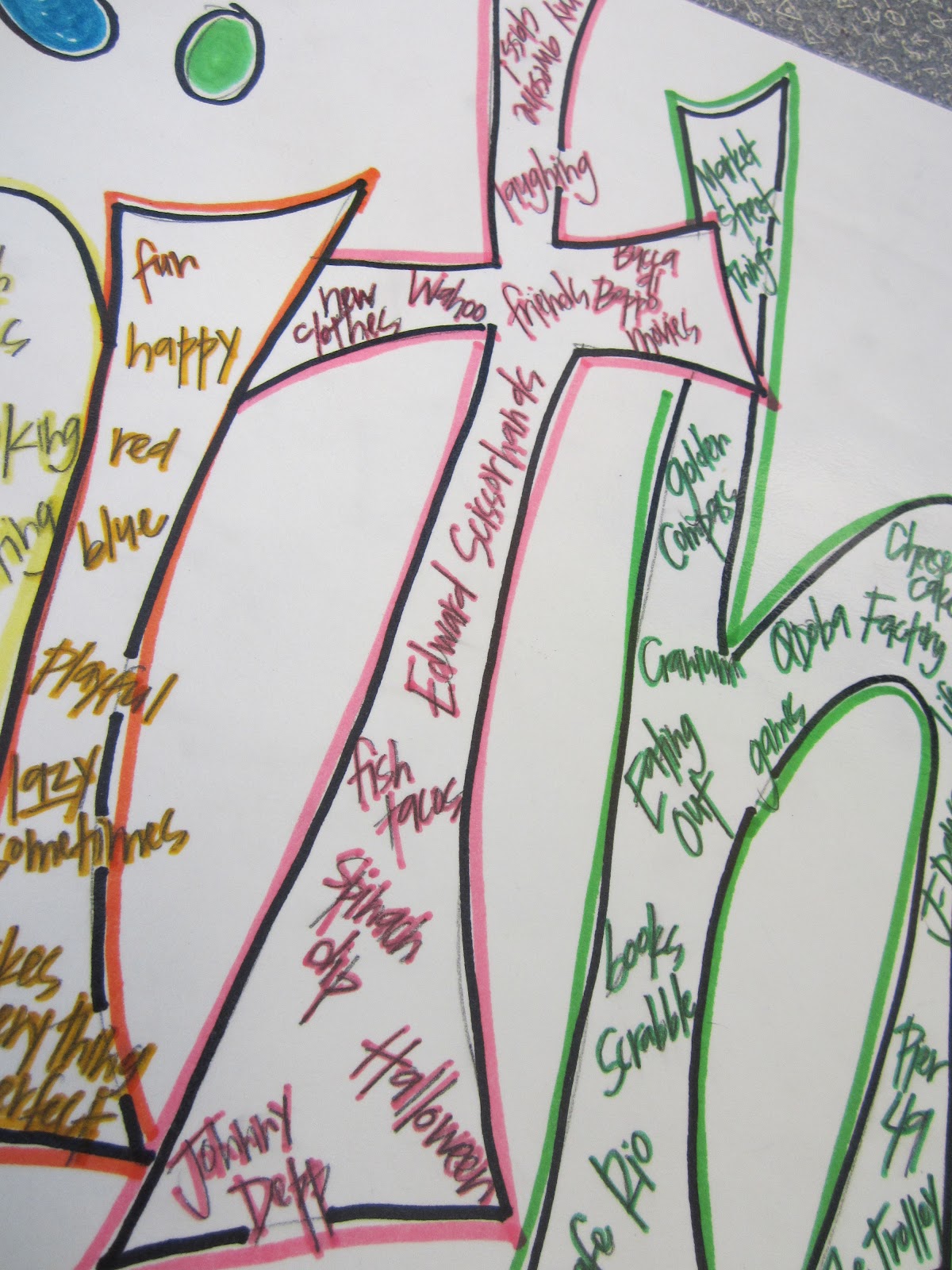 Step 6: When students are done with the words inside their letters they can add color and share their work with friends or a partner. This step is especially important if you’re using this activity after a break when students are dying to share what they did/where they went/a gift they received. You can have students put their grammatical name art around the room and have other students peruse these “gallery walk” style or do an inside/outside circle where students share words from their art until it’s time to rotate. As long as the kids feel like they got a chance to talk about whatever is exciting to them then you’re good to go.