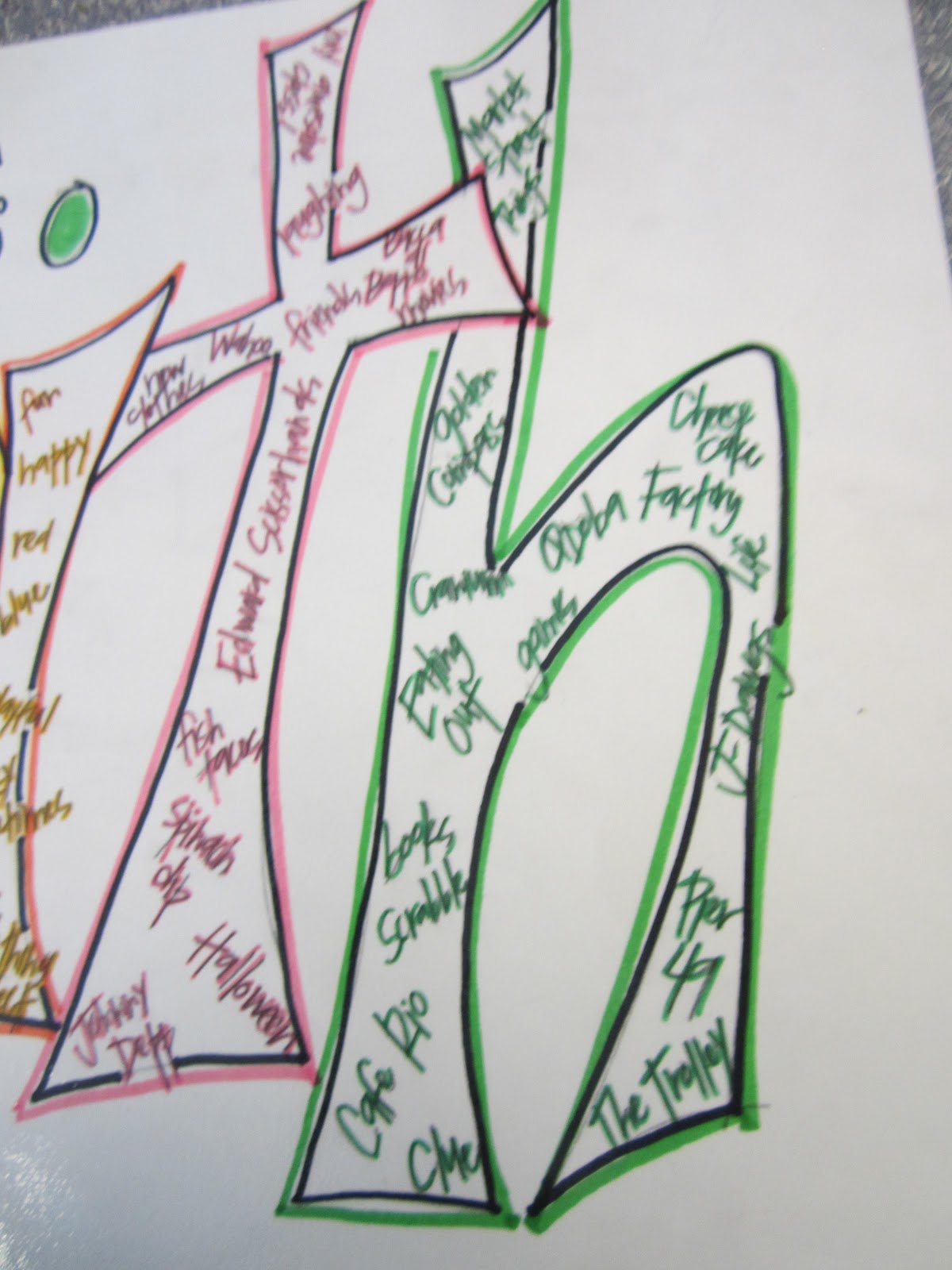 Step 5: Fill in the remaining letters with more words! Students can choose to write more nouns, verbs, or adjectives, or be creative. You decide. They can even create drawings of the words they used in the other letters. The example below shows a letter with favorites and another with additional nouns (mainly restaurants). You can also have students use numbers that relate to them (8 years old, 4 people in my family, etc.)