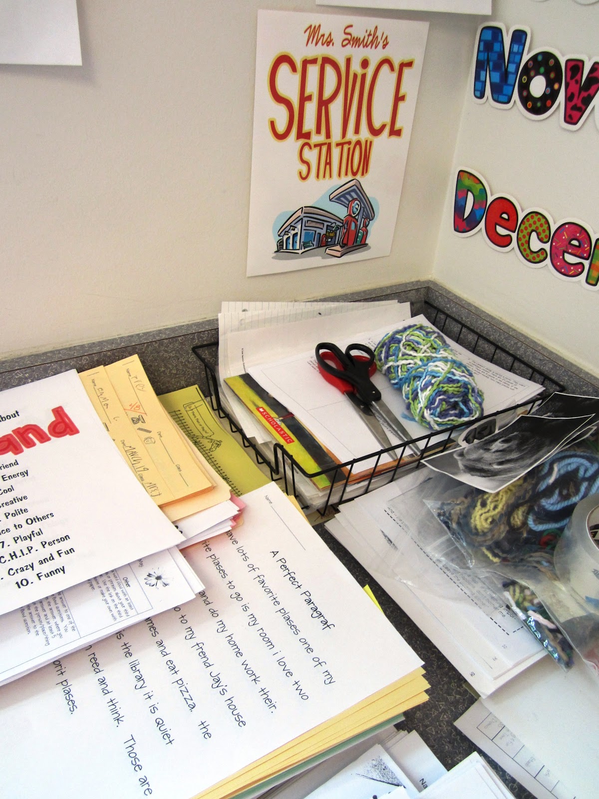 If you’d like one too, tidy up a table or corner of your classroom and set up a Service Station of your own. Train your parent helpers to look here first for projects that need making, papers that need grading, masters that need copying, or any other work that needs doing.