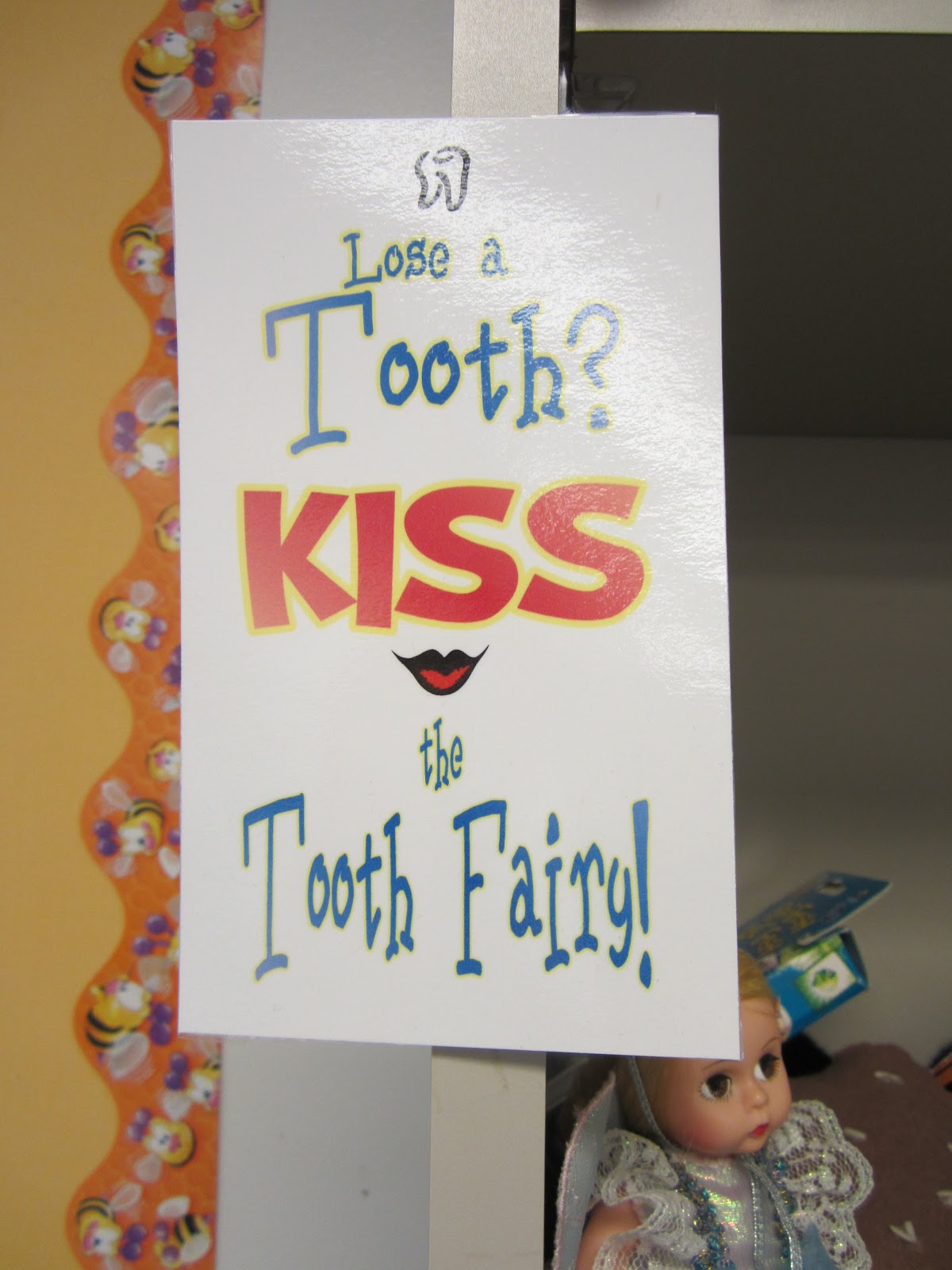 This little gal sits in my classroom next to a sign and is the extent of my attention to loose/bloody/fallen out teeth. Every once in awhile a kidlet will ask, “Do I really have to kiss her?”