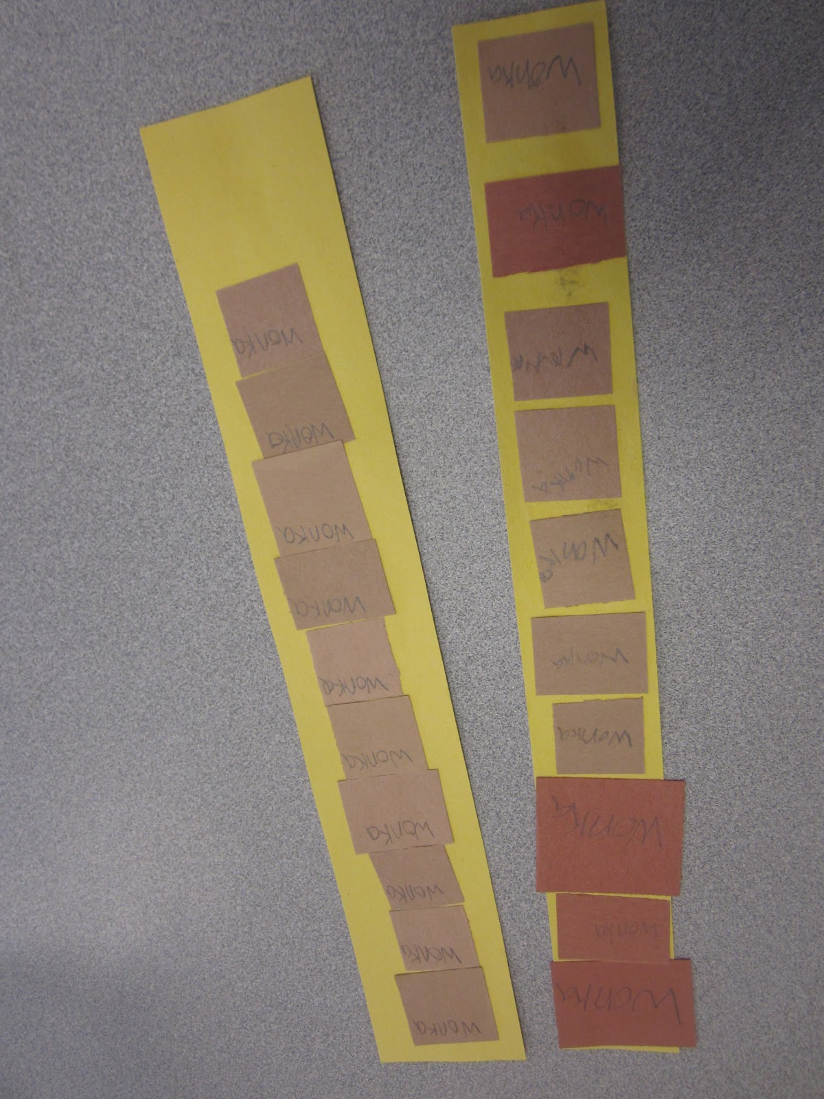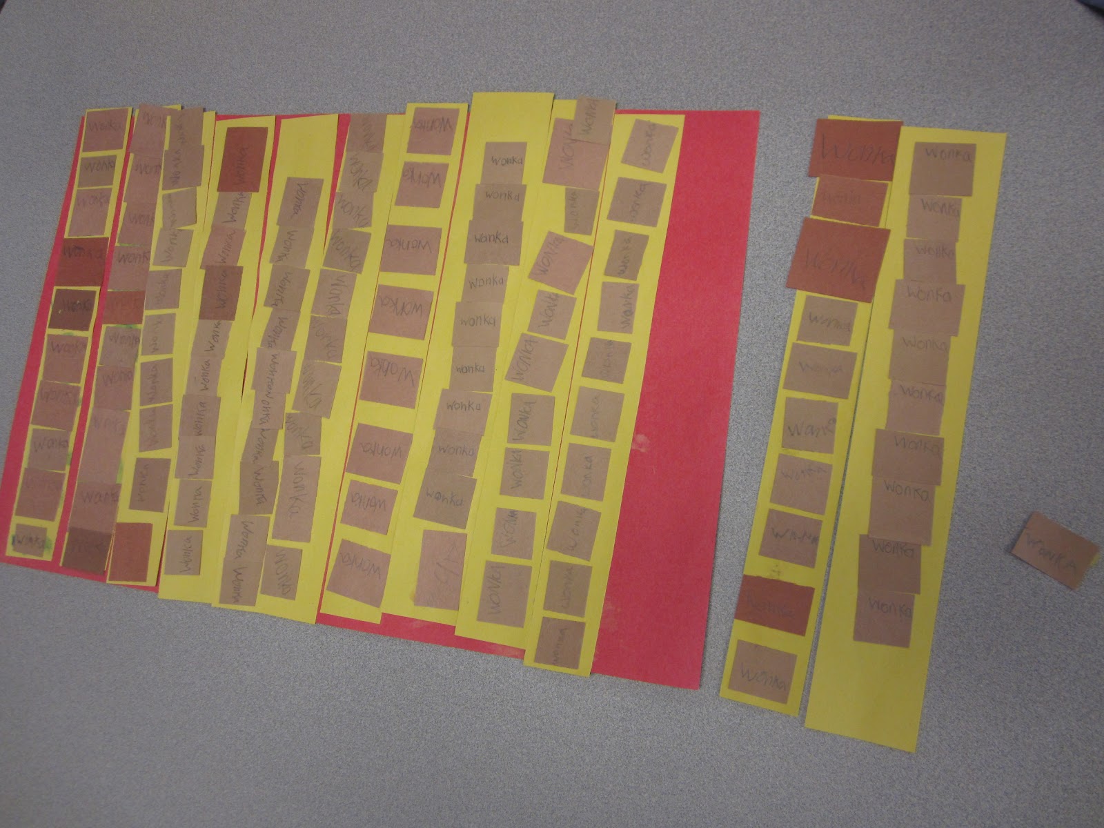 2. If you don’t have a parent volunteer, don’t worry about making the “caramel” squares perfect. Just cut long one-inch strips of brown paper and then hand cut stacks with scissors as your oompa loompas are working. They don’t need to be perfect!