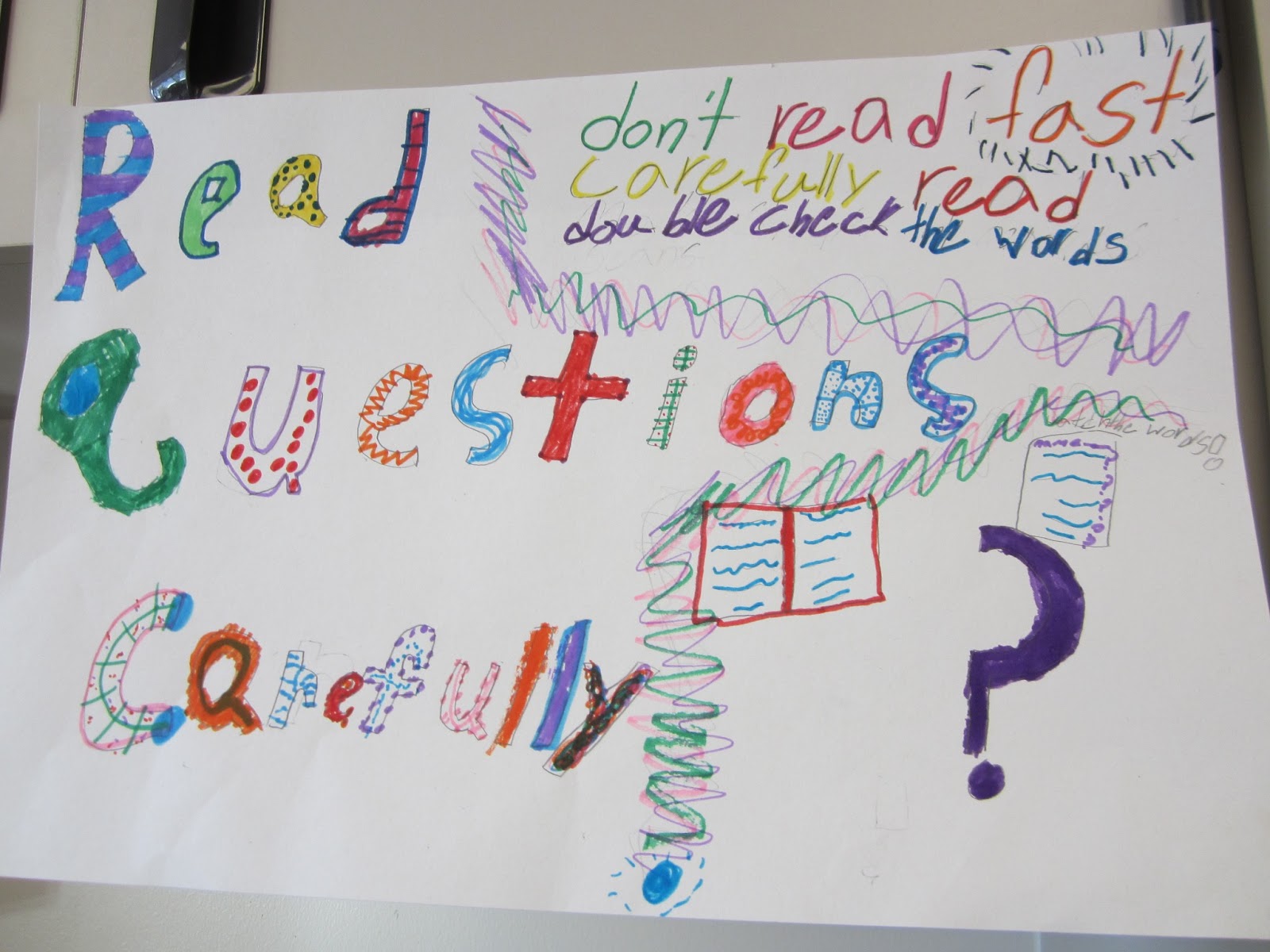 The kids' posters are super cute. I have the posters my fifth graders made last year, hanging up as reference for my students this year. Here's a link to my post about the motivational strategies I am going to use with my students this year for state testing. ~Stacy