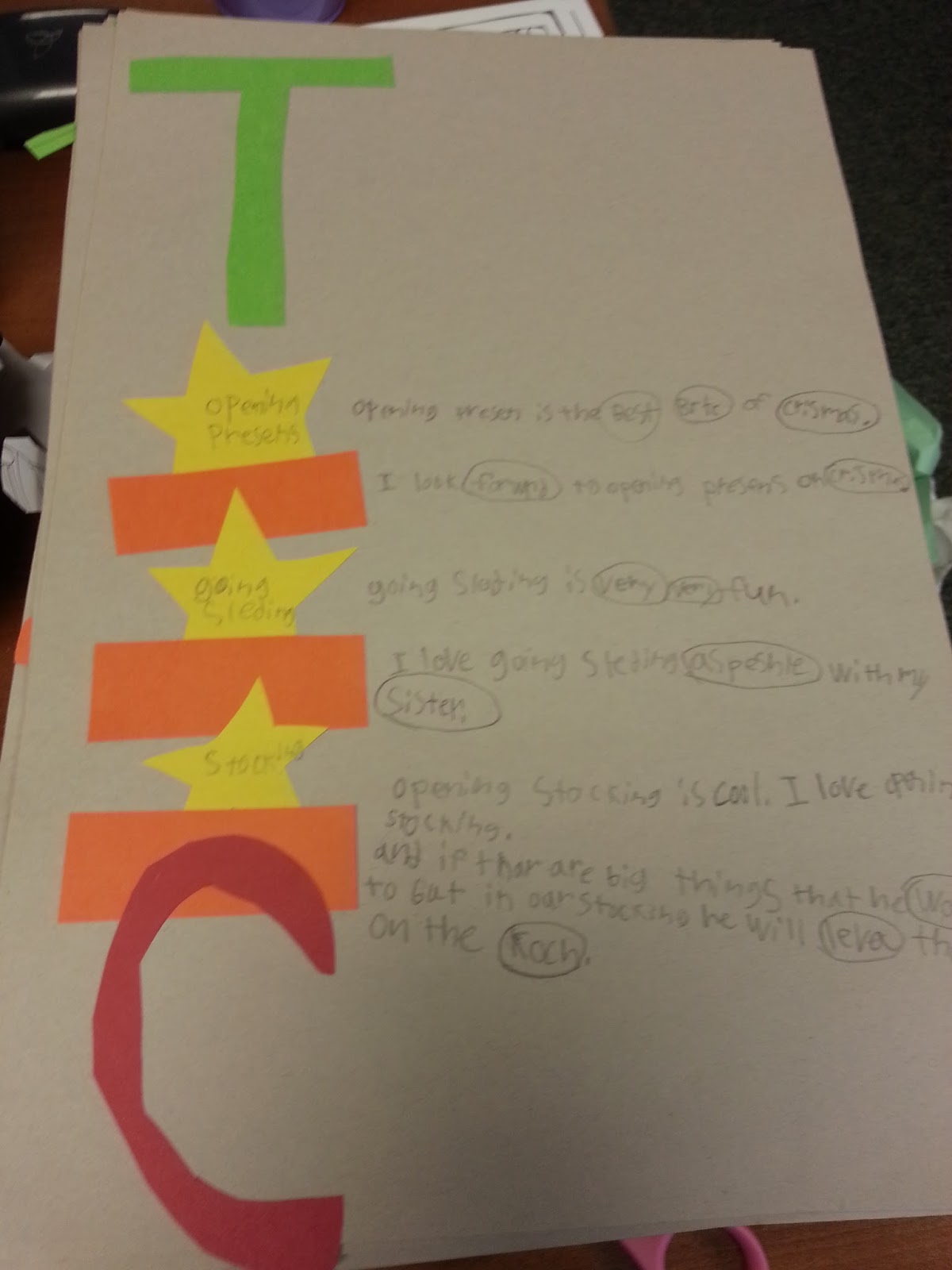 Are you teaching informational writing in the near future? If so, this activity might be helpful. I like to introduce simple paragraphs using “Stars and Bars”. In years past I’ve had parents use the fancy dicut machine, but this year I had the kids cut out all the parts (T, stars, bars, C) and it went wonderfully. It took awhile, but I think the kids will remember it better – or at least I’m hoping all that kinesthetic cutting will emblazon the T, star, bar, and C in their sweet little second grade brains. 🙂