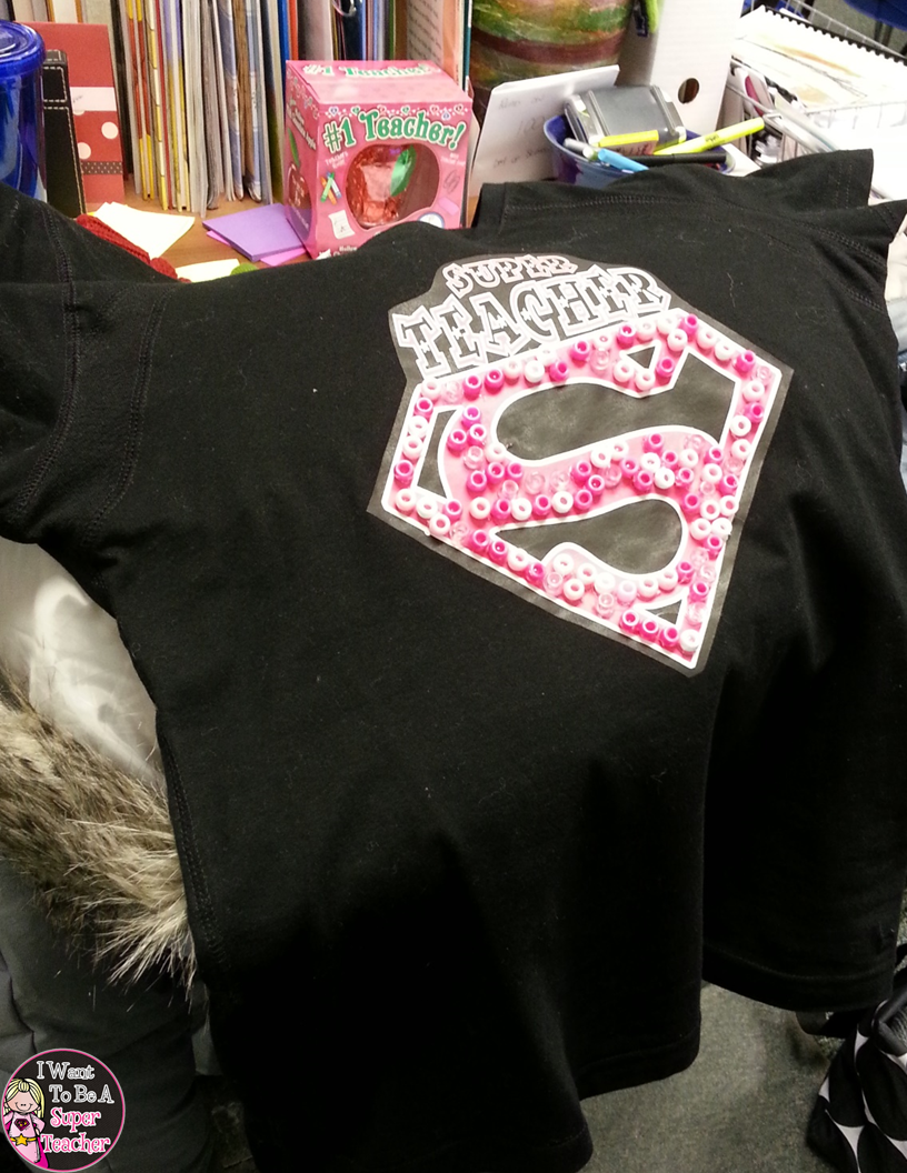 And . . . bonus! Come February- glue 100 beads to your Super Teacher shirt and you’re ready for Hundreds Day. Confession: I might be getting lazy in my old teacher age. Although at least I made sure my beads color coordinated with the Super Tee. 🙂